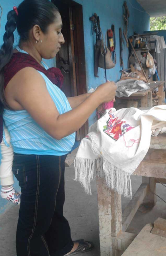 Trabajar con mujeres bordadoras permitió comprender que sus creaciones son obras construidas a través de representaciones culturales; y que el color, la textura y las figuras evidencian la cosmovisión de una cultura. Podemos entender que el bordado es una escritura antigua de Mesoamérica; como escritura y práctica es transmitida de generación a generación cuando las mujeres bordan objetos de uso cotidiano, animales y flores de la región. De acuerdo con Lechuga,[4] el bordado es uno de los recursos de ornato más importantes del mundo. Sin embargo, en su elaboración existe una variedad de estilos. El que nos interesó en la investigación fue el punto de cruz, y la razón de ello es que para las bordadoras de Tlatokxochitl en Hueycoatitla, éste representa la memoria de sus ancestros que se mantiene viva en las figuras de la indumentaria. Las bordadoras argumentan que es el que se usa más y está presente en la cotidianidad de la comunidad; además, no dejan que desaparezca porque es una herencia de los abuelos y las abuelas de la comunidad. Las bordadoras tienen un proceso de formación que comprende los principios y las estrategias de aprendizaje; en la construcción de representaciones culturales, los bordados son considerados como obra, y la creación implica saber bordar y combinar colores para poder escribir la literatura de la obra-bordado. Principios de aprendizaje de la bordadora En nuestra tesis identificamos que el aprendizaje que toda bordadora desarrolla durante su formación se refiere a dos principios básicos: el primero es el deseo de bordar, que a su vez se nutre de la seriedad, el gusto, el interés y la atención surgidos de la actividad concreta la veía bordar; el segundo se refiere a la paciencia. Estos principios interactúan constantemente y se consolidan en la actividad concreta de bordar. ![]() Mujer bordando. El principio de deseo aparece por el momento de inmediación, por la aproximación del entorno social que vive el sujeto[5] y propicia condiciones en la persona para crear la obrabordado porque “parece ‘producir’ su tiempo, su espacio, su afirmación y su fuerza”.[6] En la convivencia cotidiana de la niña junto a la experta nace el deseo de bordar. El principio de paciencia es la base del compromiso con la actividad del bordado porque genera las condiciones para que la aprendiz permanezca en todo el proceso de su aprendizaje. Cuando este principio no se desarrolla, surge el enojo, o bien las aprendices abandonan, como relata una bordadora: Sí aprendió [su hija]. Una vez le dije que hiciera todo parejo; ella lo hizo, pero se equivocó porque las cruces no se veían y lo de abajo estaba chueco. Le dije que así no era; ella se enojó y ya no quiso hacer. [7] La paciencia se demuestra cuando la aprendiz internaliza la responsabilidad con la práctica cultural del bordado. Estrategias de aprendizaje que usan las bordadoras Otro elemento que abordamos en la tesis hace referencia a las estrategias de aprendizaje que usan las bordadoras. Ellas −que pueden ser madres, abuelas, tías o vecinas− buscan diversas formas de enseñanza para transmitir su saber a las futuras bordadoras. Una de las herramientas básicas que emplean las expertas es la entrega de los materiales indispensables que ayudan a la aprendiz a manipular los hilos, la tela y la aguja. Las niñas interactúan con materiales necesarios en la elaboración de bordados, y en esta relación se crean condiciones que propician el aprendizaje en la vida cotidiana. Las bordadoras del grupo Tlatokxochitl argumentan que los cachos de telas e hilos son herramientas indispensables que estimulan acciones para el desarrollo del aprendizaje pues fungen como primeros materiales didácticos. Con éstos se estimula la ejecución de una actividad lúdica que apoya la construcción de conocimientos y saberes en la elaboración de bordados. Esas telas e hilos ayudan a desarrollar las habilidades, destrezas y actitudes que requiere cada aprendiz en su aprendizaje: Recuerdo cómo me enseñaba. Ella [su mamá] me decía, me daba un cachito de cuadrillé, hilos, allí veía cómo hacer. Ella [su mamá] me decía: ‘Ahora copia esto, así hazlo, ve haciendo así’. Yo le decía: ‘No puedo, me equivoco’, pero sí lo sacaba. [8] ![]() Amaxochitl (flor de papel). De lo expresado por la señora Albina, al recordar cómo aprendió a bordar siendo una niña, podemos deducir que los cachos de telas e hilos funcionan como estrategias de aprendizaje pues el contacto inmediato y manejo de materiales condicionan la construcción de conocimientos. Las bordadoras saben que al proporcionarles esos materiales, motivan a las aprendices a crear bordados. Por otro lado, los pedazos de telas e hilos son usados para que la aprendiz se vaya adaptando y conociendo las formas de elaborar bordados; también con estos materiales se desarrollan las estrategias de enseñarse a sí mismas y con las demás. Cuando la aprendiz toma la iniciativa de aprender por sí sola a bordar, se enseña a sí misma. Es decir, a partir de la convivencia y participación cercana con la experta, conoce algunos estilos del bordado y se consolida la curiosidad de toda aprendiz. Paradise diría: “se espera que el niño tome la iniciativa en el aprendizaje”.[9] Enseñarse con las demás consiste en que la aprendiz aprende de otras personas para llegar a bordar. Esta estrategia posibilita que la aprendiz realice la práctica y junto con la experta aprenda nuevos estilos de bordado. En esta estrategia la participación es fundamental porque “sugiere un interés explícito sobre la persona, pero como persona en el mundo, como miembros de una comunidad sociocultural”.[10] ![]() Bordado de un rebozo tradicional. Las estrategias enseñarse a sí misma y enseñarse con las demás generan un espacio comunitario donde se aprende a compartir, a dialogar, a enseñar lo que se sabe, y donde los consejos toman lugar. En la educación del pueblo náhu