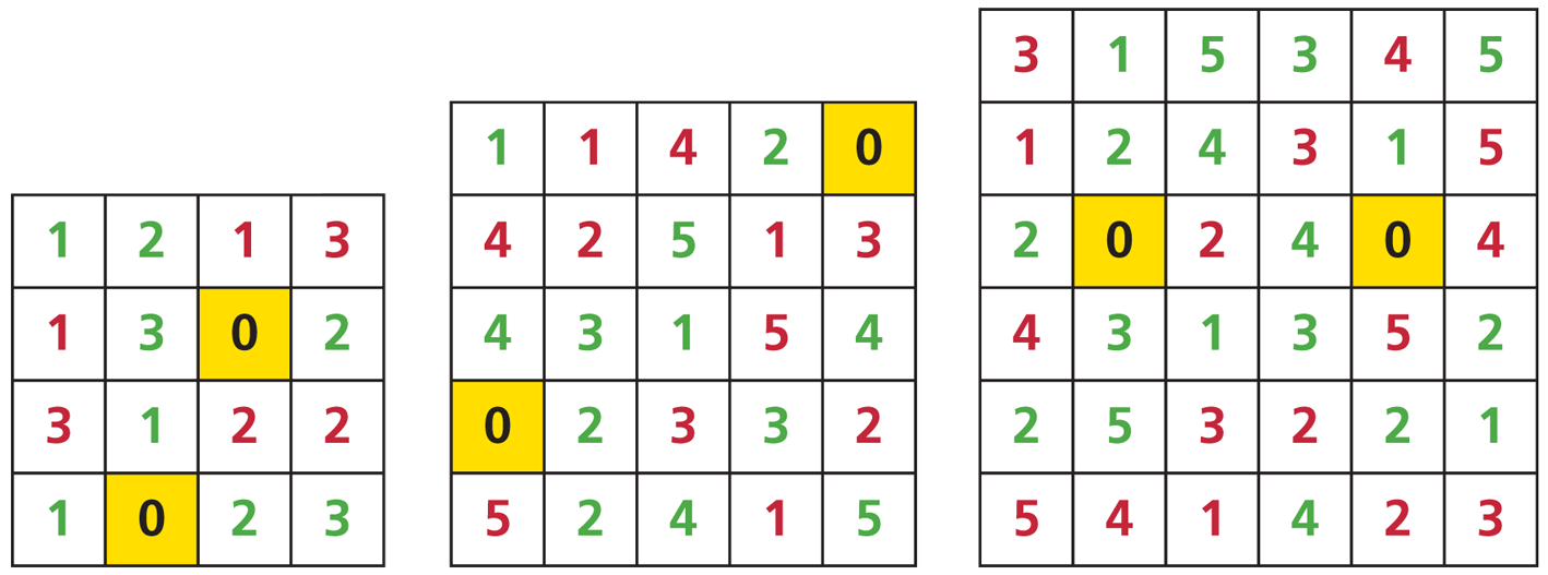 Para los tres retos, el objetivo es unir los dos ceros en la cuadrícula mediante un camino cuyos números sumen cero; los números verdes suman, los rojos restan.