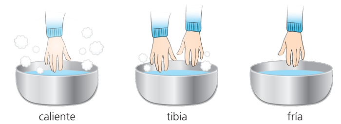 ¿Crees que nuestro sentido del tacto es confiable como instrumento para medir la temperatura? A fin de determinarlo, efectúa el siguiente experimento: Toma tres recipientes de vidrio o de plástico, en los que verterás: agua caliente en uno, agua tibia en otro y agua fría con algunos hielos en el tercero. Luego, introduce la mano izquierda en el agua caliente y la derecha en la fría, y mantenlas dentro del agua por lo menos durante un minuto. Retira ambas manos de los recipientes e introdúcelas en el recipiente central, que contiene agua tibia. ¿Qué sientes en cada mano? Sugerimos al maestro establecer una discusión grupal luego de realizar la actividad, en la que se concluya que a pesar de que ambas manos están a la misma temperatura (la del agua tibia), la mano que estaba en el agua caliente cede calor al agua tibia y por lo mismo siente frío, mientras que la mano que estaba en el agua helada absorbe calor del agua tibia, por lo que la siente caliente. ![]() También se transmite calor cuando alguien se acerca a una fogata: el calor del fuego se transmite al aire, y de éste al cuerpo, que se calienta. Si, por otro lado, durante un día helado, se sale al exterior sin abrigo adecuado, el calor del cuerpo se transfiere al aire que lo rodea y se siente inmediatamente frío. Como se observa, al transmitirse energía térmica, el cuerpo que cede energía se enfría y el que la recibe se calienta; en otras palabras, el calor siempre viaja de algo caliente a algo frío, nunca al revés. Cuando dos cuerpos con diferente temperatura entran en contacto térmico y hay una transferencia de calor entre ellos, al paso del tiempo ambos alcanzan la misma temperatura y ya no fluye calor entre ellos. En ese momento se dice que han alcanzado el equilibrio térmico. ▼ ¿Cómo ocurre la transferencia de calor?