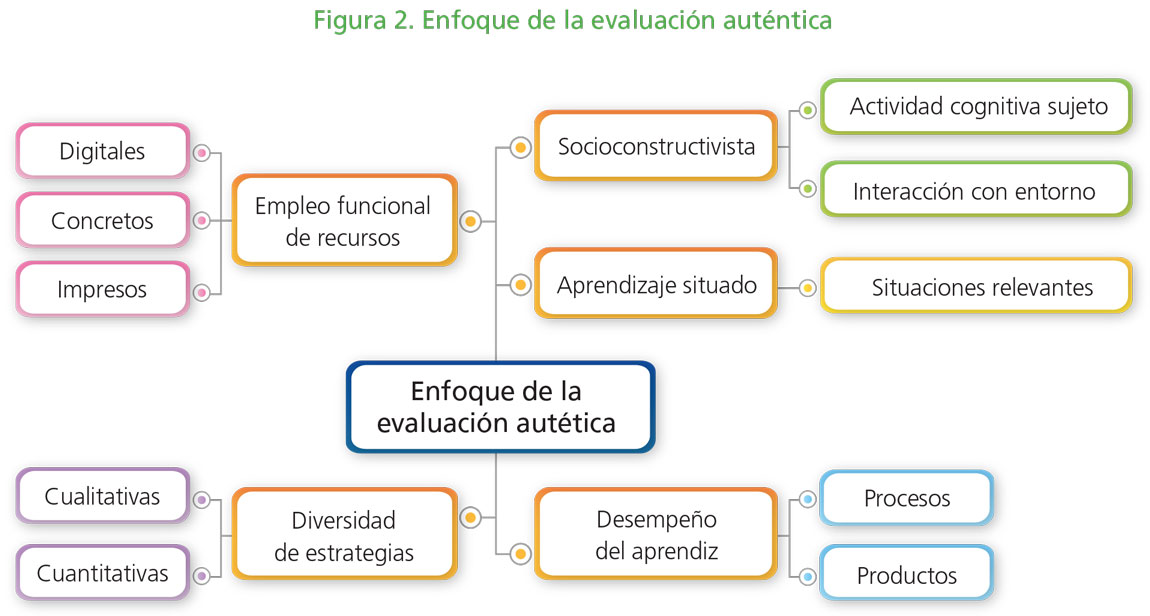 Las rúbricas permiten valorar actividades vinculadas a procedimientos, productos y disposiciones a la acción que tienen sentido para los alumnos, lo cual les ayuda en su proceso de aprendizaje. Algunos autores consideran que estos instrumentos propician lo que se denomina evaluación auténtica. [La evaluación auténtica consiste en propiciar] que los aprendices resuelvan activamente tareas complejas y auténticas mientras usan sus conocimientos previos, el aprendizaje reciente y las habilidades relevantes para la solución de problemas reales (Herman, Aschbacher y Winters, 1992, p. 2, citado en Díaz Barriga, 2006, pp. 126-127). La evaluación auténtica va un paso más allá en el sentido de que destaca la importancia de la aplicación de la habilidad en el contexto de una situación relevante en la vida real, es decir, se despliega una competencia (Díaz Barriga, 2006, p. 127). A partir del enfoque de la evaluación auténtica (figura 2), se puede redimensionar la potencialidad de las rúbricas como facilitadoras de la autorregulación y la autonomía, que son dos habilidades para la vida que forman parte de la educación socioemocional de los estudiantes.