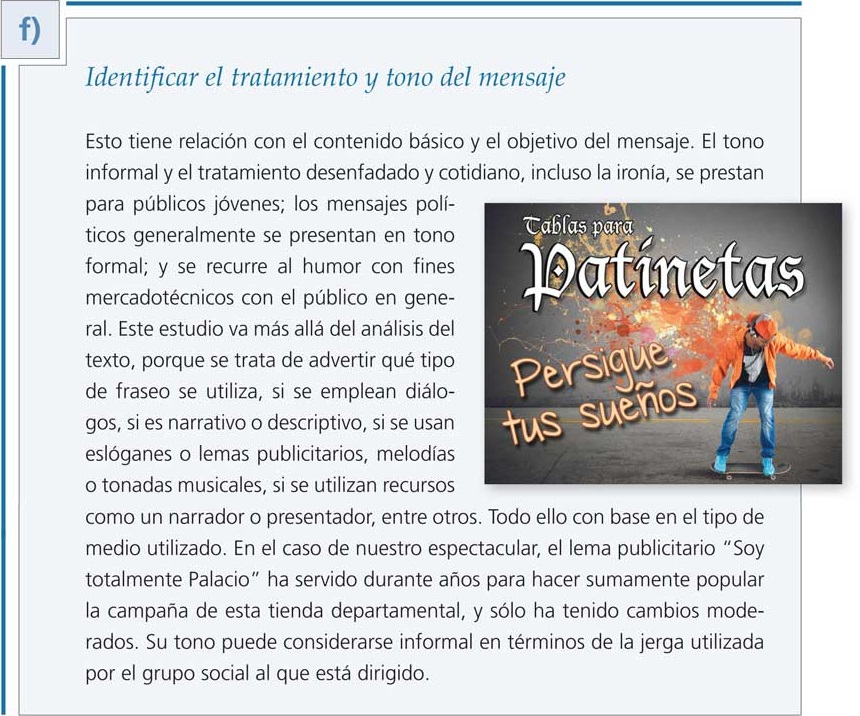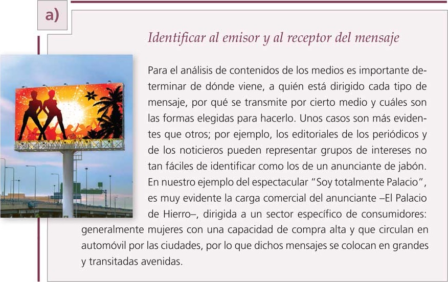 comúnmente nos quejamos de la baja calidad de los contenidos de los medios de comunicación masiva en cuanto a lenguaje, presentación y propuestas. El primer paso para mejorar lo que recibimos es someterlo al análisis y a la crítica, a fin de poder definir con claridad qué debemos exigir como consumidores e incluso formular propuestas. Resulta muy valioso que el aula sea un lugar donde este tema pueda ponerse a discusión. El análisis de los mensajes que nos ofrecen los medios es complejo porque su estudio implica saber discernir el tipo de información que contienen, los objetivos que persiguen, el tipo de lenguaje que utilizan y su valor en términos de contenidos útiles para el desarrollo personal de los jóvenes como integrantes activos de la sociedad. La crítica sistematizada y guiada en un salón de clase puede ser el germen de una actitud pensante, exigente y propositiva de los alumnos como consumidores y también como futuros productores de los contenidos que los medios difundan. Dado que los jóvenes están muy familiarizados con la dinámica y el lenguaje de los medios de comunicación, el análisis de sus mensajes constituye una oportunidad para usar y revisar algunos temas y herramientas relevantes de las competencias comunicativas, desde la lectura comentada, hasta la elaboración de textos y guiones de diverso género adecuados para distintos medios, pasando por el análisis de los elementos textuales y metatextuales y la simbología de los lenguajes no verbales que se encuentran en los diversos medios. El campo de los medios de comunicación masiva es tan amplio que abarca tanto expresiones que pueden ser casi exclusivamente artísticas –algunas películas y publicaciones culturales– como expresiones tan profanas como los anuncios comerciales y los discursos y programas de análisis político. En un término medio, estarían los programas, revistas y emisiones radiales de divulgación científica, documentales y producciones de información general, así como los programas televisivos de entretenimiento como series, telenovelas, concursos, y programas de servicio social. Esta variedad tan compleja refleja que prácticamente todos tenemos algo que decir, a quién decirlo y cómo hacerlo. En las actividades de aprendizaje que se planeen para estudiar las emisiones de los medios de comunicación masiva, es preciso trabajar sobre elementos comunes que se pueden identificar sistemáticamente y luego analizar a profundidad: