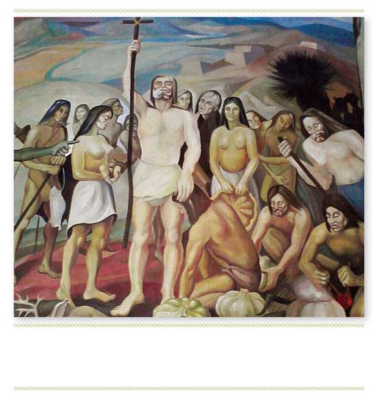 Detalle del mural Los primeros hombres procedentes de Europa realizado por el pintor Aarón Piña Mora (1914-2009) en el Palacio de Gobierno de Chihuahua que muestra a Álvar Núñez Cabeza de Vaca al centro representando a los primeros hombres blancos que pisaron Chihuahua ▼ La seducción del naufragio