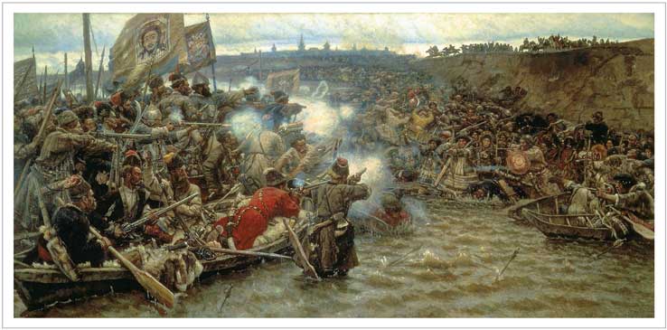 La batalla de Pereyáslav-Zaleski (1238), donde los mongoles de Batu (nieto de Gengis Kan) derrotaron al duque de Vladimir-Súzdal, Andréi Jaroslavič, fue decisiva para acabar con la oposición organizada contra los mongoles durante el siguiente siglo. Los rusos, liderados por Aleksandr Nevski, príncipe de Nóvgorod y Kiev, junto con sus descendientes, se convirtieron en vasallos y tributarios del kan de la Horda de Oro.[4] Los nobles y los terratenientes rusos aceptaron el sometimiento a los mongoles porque se hallaban profunda y mezquinamente divididos entre sí y porque la Iglesia ortodoxa era un mediador amistoso hacia los invasores, ya que éstos le otorgaban privilegios tributarios muy considerables. Después, poco a poco, el principado de Moscú comenzó a descollar y hacerse el más poderoso entre los ducados y principados rusos del siglo XIV. En gran parte, esta primacía fue producto de la habilidad de los príncipes moscovitas para mantener su alianza con los tártaros[5] y someter a los otros príncipes cristianos, además de la realización de afortunadas alianzas matrimoniales. El traslado del metropolitano (cabeza de la Iglesia ortodoxa) de Kiev a Moscú también contribuyó a esta primacía. A fines del siglo XIV, decayó el poder del kanato de la Horda de Oro y su unidad se rompió. Se formaron entonces otros kanatos más pequeños, uno de los cuales fue el de Sibir (nombre que dio origen al de Siberia),[6] así como el de Kazán y el de Astrakán. Sin embargo, en el siglo XVI, el poder de los zares[7] Iván III “el Grande” e Iván IV “el Terrible” se enfrentó con relativo éxito al menguado poder de los kanatos tártaros. Pero es necesario precisar aquí que durante los siglos XVI y XVII, la exploración y la colonización de los rusos en Siberia fue más bien producto de empresas particulares, que de un esfuerzo decididamente apoyado por el Estado moscovita. El envío de tropas regulares y recursos de los zares sólo ganó impulso a partir del siglo XVIII con el gobierno de Pedro “el Grande”. En 1515, el comerciante Anikéi Fiódorovich Stróganov (1488-1570) obtuvo concesiones del zar Iván IV para explotar yacimientos salineros a lo largo de los ríos Kama y Chusovaya, que en ese momento eran el límite oriental de Rusia; poco a poco, Stróganov hizo crecer sus negocios incluyendo la obtención del “oro suave”, es decir, las finas pieles de los animales siberianos que ya mencionamos. Su hijo Semión Anikéyevich Stróganov y sus nietos Maksim Yakóvlevich y Nikita Grigóriyevich fueron los artífices y financieros de la campaña conducida en el interior de Siberia por el cosaco[8] Yermak Timoféyevich en 1581. Los Stróganov, pensando estratégicamente que “la mejor defensa es el ataque”, equiparon a los cosacos de Yermak y los enviaron a reclamar los territorios bajo el dominio del kan Kuchum, gobernante del kanato de Sibir. ![]() ► Yermak Timoféyevich, uno de los primeros exploradores de Siberia El imperio siberiano del zar Kuchum no comprendía la Siberia que hoy vemos en el mapa. Consistía sólo en una pequeña parte de ella […] que, sin embargo, ocupaba precisamente la región a través de la que el camino iba hacia el este desde los Urales hasta Mangazeya [el nombre antiguo de la zona central de Siberia]. Por eso bloqueaba ese camino como un tronco de árbol caído, que tenía que ser removido y Yermak lo hizo […] Y lo logró pronto y con unas fuerzas muy pequeñas. Tenía ochocientos hombres [otras fuentes señalan el doble de esta cantidad]; Kuchum tenía muchos más. Sus fuerzas estaban mejor armadas que las del zar siberiano, pero su superioridad no era de ninguna manera comparable a aquella de los españoles en América sobre los indios, quienes ni siquiera poseían armas de hierro. Yermak no tenía cañones y sólo un pequeño número de sus hombres cargaban armas de fuego. Los cosacos no tenían un solo caballo, mientras que Kuchum y sus hombres iban montados. Su caballería podía moverse rápidamente y en cualquier dirección. Mientras que los cosacos estaban atados a sus balsas, además cargadas con todas sus provisiones (Semyonov, 1944: 74). Tras algunos enfrentamientos previos, la tropa de Yermak infringió una fuerte derrota a los tártaros a principios de octubre de 1582 en las orillas del cabo Chuvash, lo que le permitió poner sitio y tomar la población de Qashliq, lugar de residencia habitual del kan, que la abandonó para retirarse a las estepas. Yermak quedó así, al menos por el momento, como dueño de los dominios de Kuchum. Esa victoria y otras que le siguieron posibilitaron a la familia Stróganov ofrecer la corona de Siberia al zar de Moscú y obtener para ellos más concesiones y algunos títulos de nobleza. Pero para Yermak, la recompensa fue otra. En agosto de 1584, en una isla del río Irtysh, apenas separada de los bancos del río por una delgada corriente, él y parte de su tropa levantaron un campamento y se fueron a dormir; Kuchum y su gente, que habían regresado a tomar venganza, los sorprendieron con un ataque nocturno; sólo uno de los cosacos pudo escapar de la carnicería y regresar maltrecho a las tierras de los Stróganov; de Yermak no se supo más, aunque la tradición cuenta que se ahogó sumergido por el peso de su armadura –supuestamente un regalo del zar Iván– cuando trató de huir nadando. El resto de los cosacos de Yermak abandonaron Siberia en el otoño de 1584. Así acabó el primer intento de conquistar Siberia por parte de los rusos. ![]() ► La conquista de Siberia por Yermak, pintura al óleo de Vasili Súrikov (1895) Muy pronto, otros cosacos, otros comerciantes y muchos cazadores de pieles preciosas irrumpirían más adentro de Mangazeya. En 1607, se erigió un campamento semipermanente en la parte norte del río Yeniséi, y, en 1619, se fundó el ostrog, es decir, el fuerte, llamado Yeniseysk, en el curso central del río, frente a la boca de uno de sus afluentes, el