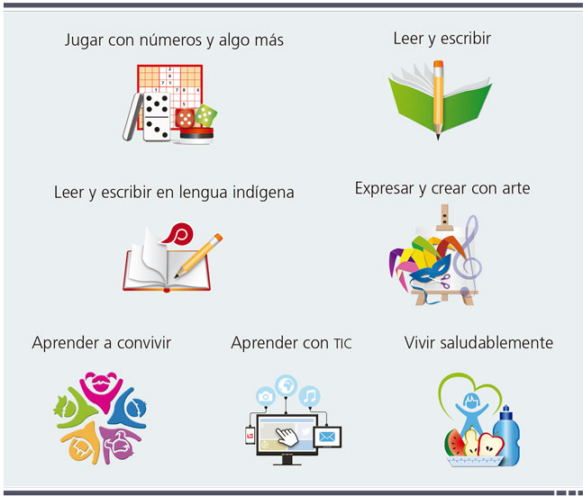 La estrategia educativa de las Escuelas de Tiempo Completo se caracteriza por la ampliación de la jornada escolar, para alcanzar entre 6 y 8 horas diarias, con el propósito de fortalecer la calidad de los aprendizajes; optimizar el uso efectivo del tiempo escolar con el objetivo de reforzar las competencias lectoras y escritoras, de matemáticas, arte y cultura, en un ambiente de inclusión y convivencia. La ampliación del tiempo permite, en el caso de la educación primaria, pasar de 800 horas de trabajo escolar a 1200 horas anuales (SEP, 2014: 20-21) considerando un ciclo escolar de 200 días laborales como marca el calendario escolar, es decir, 50 por ciento más de tiempo. Es indiscutible que la ampliación de la jornada escolar, por sí misma, no transforma favorablemente las oportunidades de aprendizaje de los alumnos; para ello es necesario recorrer un sinuoso camino, lleno de retos en diferentes ámbitos, como: la gestión escolar y la reorganización administrativa; la habilitación de la infraestructura para garantizar el servicio de alimentación de los alumnos en las escuelas que requieren dicho apoyo, las cuales son precisamente aquellas que mayores carencias de infraestructura tienen;[1] la propia representación social de los padres respecto a los procesos educativos; la asistencia de los hijos a la escuela, ya que los alumnos de comunidades con un alto nivel de pobreza a menudo colaboran en las tareas productivas, además, con frecuencia tal decisión pasa por el rol de géneros. Asimismo, es un reto trasformar las oportunidades de aprendizaje para los alumnos, al innovar las prácticas de enseñanza a cargo de los docentes y valorar y promover aquellas que fortalecen las competencias para aprender a aprender. Otras de las características de las Escuelas de Tiempo Completo, en particular sobre el desarrollo de la propuesta pedagógica, se expresan en las siete Líneas de Trabajo Educativas, que son: ![]() Cabe señalar que estas escuelas implementan las Líneas de Trabajo Educativas, las cuales se vinculan “con el enfoque, los aprendizajes esperados y los Programas de estudio vigentes” (SEP, 2014: 24). Lo determinante se logra cuando los docentes implementan actividades de aprendizaje, sustentadas en variadas formas de trabajo, como proyectos de conocimiento, desafíos de aprendizaje, situaciones dilemáticas, secuencias didácticas, actividades de investigación, círculo de lectores, las cuales dan oportunidad para que los alumnos recuperen sus saberes, los ensanchen y transiten rutas de progresión en el aprendizaje. Asimismo, parte de la organización esperada considera la promoción del reconocimiento de la heterogeneidad en el grupo, como una forma de generar condiciones de equidad educativa al favorecer la educación inclusiva, a fin de lograr la permanencia de los educandos con más bajo desempeño en el servicio educativo. ▼ Materiales didácticos para aprender
