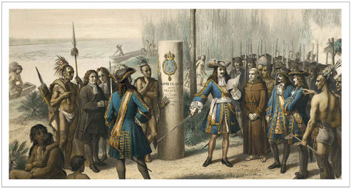 Esta obra del litógrafo Jean-Adolphe Bocquin muestra la toma de posesión que hizo Cavelier de La Salle de La Louisiana y el río Mississippi en nombre del reino de Francia Alertadas por un desertor de la expedición de La Salle que venturosamente logró abrirse camino hasta la isla caribeña de Santo Domingo, las autoridades españolas emprendieron la búsqueda del puesto de avanzada de los franceses en las orillas del golfo cuyo dominio no estaban dispuestas a compartir con nadie. Durante tres años, varias expediciones españolas por mar y tierra trataron de descubrir infructuosamente la posición de los franceses. Por fin, en la primavera de 1689, el capitán y gobernador de Nuevo León y Coahuila, Alonso de León, encontró los vestigios que comprobaban la tragedia sufrida por La Salle. A través de los restos de varias personas –entre ellas una mujer–, de los objetos de origen europeo diseminados en el área que había ocupado el fuerte y de las argumentaciones de tres franceses que habían sobrevivido al colapso, los españoles se enteraron de que la expedición había perdido sus barcos, que luego mucha gente había muerto por enfermedades, hambre o por exposición a las inclemencias del clima, de que el propio La Salle había sido asesinado por algunos de sus subordinados y de que, finalmente, aprovechando tanto la debilidad como las disensiones de los intrusos, los nativos karankawas habían acabado con los que aún vivían. Así, al igual que la entrada de Hernando de Soto, los recorridos y el intento colonizador efectuado por Cavelier de La Salle fueron efímeros en un sentido, pero en otro, de manera similar al español, este francés puede considerarse el precursor del reclamo de la soberanía de Francia sobre el Mississippi. Antes de entrar a la revisión de este otro reclamo, repasemos la actuación de un tercer contendiente en la lucha sobre el inmenso territorio que los franceses –y tras ellos todos los demás europeos– llamaron La Louisiana en honor al Rey Sol. ▼ Las trece colonias se expanden