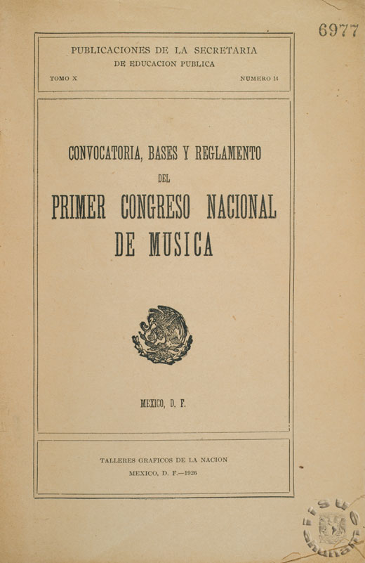 La convocatoria impresa al Primer Congreso Nacional del Música,[1] que se efectuaría en septiembre de 1926, fue emitida por la Secretaría de Educación Pública y por la Junta Preparatoria por medio de una comisión conformada por los reconocidos músicos Estanislao Mejía (como presidente), Daniel Castañeda (secretario general), Francisco Domínguez (secretario de correspondencia), y Alba Herrera y Ogazón, Manuel Barajas, Juan León Mariscal, Ignacio Montiel y Jesús C. Romero (como vocales). Dirigida a músicos, compositores y musicógrafos, la convocatoria plantea nueve considerandos, y divide las bases en seis capítulos sobre los siguientes puntos: los congresistas honorarios y activos (capítulo I); los temas y las formas de participación en el Congreso (capítulo II); la organización interna y resolutiva por comisiones (capítulo III); el orden del día en la instalación y en las sesiones consecutivas (capítulos IV y V); y las formas del intercambio en el debate (capítulo VI). ▼ La historia
