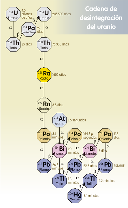 Ahora hablemos de radioactividad. Inicialmente, recordemos un modelo sencillo de lo que es un átomo. Está formado con tres tipos de partículas: los protones, con carga positiva; los electrones, con carga negativa, en una misma cantidad que los protones, pero con una masa mucho más pequeña; y los neutrones, del mismo tamaño y casi con la misma masa que los protones, pero sin carga eléctrica. Los protones y los neutrones forman el núcleo del átomo alrededor del cual giran los electrones. El núcleo del átomo es extraordinariamente pequeño en comparación con el volumen de un átomo; sin embargo, el núcleo tiene una masa casi dos mil veces mayor a la de los electrones, por lo que el peso del átomo está concentrado en el núcleo. Cada elemento se caracteriza por la cantidad de protones que posee. Si el átomo tiene 26 protones, se trata de un átomo de hierro; si tiene 20 protones, será un átomo de calcio; y si posee un núcleo con 7 protones, se trata del elemento nitrógeno. En suma, la cantidad de protones determina el elemento del que se trata. Existen elementos de un mismo elemento, es decir, con la misma cantidad de protones y que poseen diferente cantidad de neutrones. A estos átomos, que no son exactamente iguales, se les llama isótopos de un mismo elemento; por ejemplo, existen dos isótopos del hierro, elemento que tiene 26 protones, uno con 30 neutrones y otro que tiene 28. Nos referimos al primero como hierro-56, mismo que se denota 56Fe y el segundo como hierro-54 o 54Fe. Nótese que el 56 y el 54 son la suma del número de protones y neutrones. Como se mencionó anteriormente, el núcleo del átomo está conformado por los protones y los neutrones; sin embargo, ¿cómo es posible que los protones que tienen carga positiva se mantengan juntos, si de acuerdo con las leyes del electromagnetismo las cargas del mismo signo tienden a repelerse entre sí? Pues sucede que hay una fuerza llamada interacción nuclear fuerte, que es la responsable de mantener unidas a las partículas que forman el núcleo atómico. Esta fuerza es muy intensa cuando los protones y neutrones están muy cerca unos de otros, pero disminuye fuertemente si se alejan entre ellos. Cuando los protones están cerca en núcleos pequeños, la fuerza nuclear supera a la fuerza eléctrica de repulsión y el núcleo es estable. Pero para protones lejanos, como aquellos que están en lados opuestos en núcleos grandes, la fuerza nuclear fuerte de atracción puede ser pequeña en comparación con la fuerza eléctrica de repulsión. En consecuencia, un núcleo mayor no es tan estable como uno más pequeño. Más de 99 por ciento de los átomos en nuestro medio ambiente son estables, lo cual significa que no cambiarán en el tiempo. En contraste, algunos tipos de átomos son inestables, pues se irán transformando con el tiempo de un elemento a otro diferente. De hecho, los elementos por arriba del plomo, que tiene 82 protones, son radioactivos, ya que emiten alguno de los tres tipos de radiación: alfa, beta o gamma. Los rayos alfa son núcleos de helio formados por dos protones y dos neutrones, por lo que tienen carga eléctrica positiva (les faltan los electrones); los rayos beta son electrones y por tanto poseen una carga negativa; y los rayos gamma, que no tienen carga eléctrica alguna, son radiación electromagnética con una frecuencia superior a la de los rayos X, lo cual los hace altamente energéticos y peligrosos. Es importante destacar que las radiaciones anteriores se generan en el núcleo de estos elementos, por lo que estas emisiones hacen que el núcleo se vaya transformando, de tal modo que se forma un elemento distinto. A este cambio de un elemento en otro se le llama transmutación. Pongamos un ejemplo: el uranio-238, cuyo núcleo contiene 92 protones y 146 neutrones, al emitir una partícula alfa (un núcleo de helio), se queda con dos protones y dos neutrones menos. El resultado es un núcleo diferente que contiene 90 protones y 144 neutrones. Este núcleo corresponde a un elemento distinto: el torio-234. Pero este último elemento también es radioactivo, de tal forma que al emitir un rayo beta (un electrón), se descompone en protactinio-234 y así continúa una cadena de 13 desintegraciones más con emisiones de partículas alfa y beta, hasta llegar al plomo-206, que es estable y por lo tanto ya no se transforma en otro elemento. Las series de desintegración que existen en la naturaleza muestran que no hay ningún elemento estable más allá del plomo, pues todos los elementos en esa región sufrirán desintegraciones en cadena. La razón de ello es la existencia de demasiados protones en el núcleo que impiden que se mantenga estable.